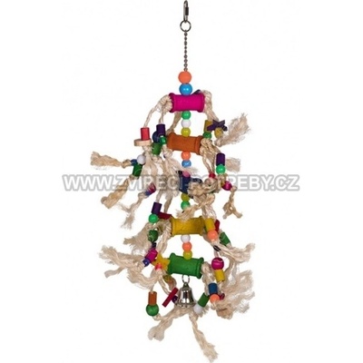 Aktivní hračka pro střední papoušky. Připevňuje se snadno ke kleci, pomocí karabinky se šroubovacím zavíráním. Hračka obsahuje: dřevěnné části, pletené míčky a zvoneček. ...