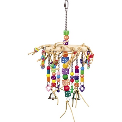 Závěsná dřevěná hračka se zvonkem vhodná pro střední a velké exotické ptactvo. Velikost: 30 x 12 cm.