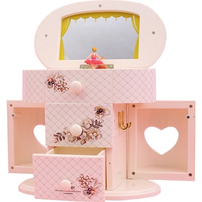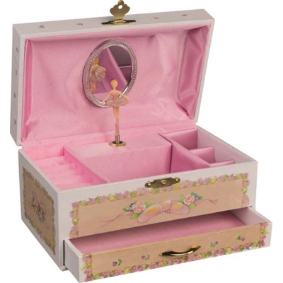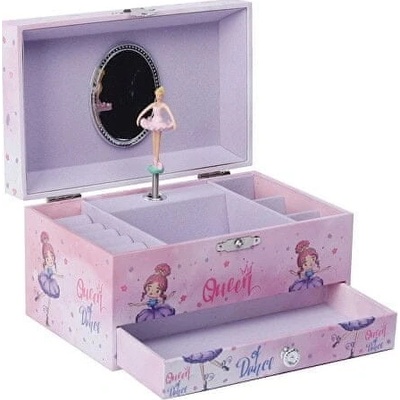 Šperkovnice se zásuvkou ve stylu hrací skříňky potěší malé dámy, které touží uložit své šperky jak se patří. Po otevření skříňky začne hrát jemná melodie z opery Labutí jezero...