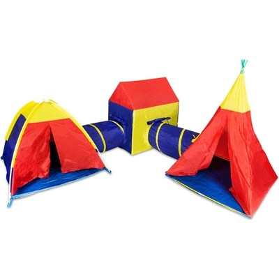 \nHerní soustava se dvěma dětskými stany spojenými prolézacím tunelem - ideální bunkrová základna pro Vaše dítě. \n Dětský set se skládá ze tří kostek a tří spojovacích tunelů. \n Barevné kostky maj