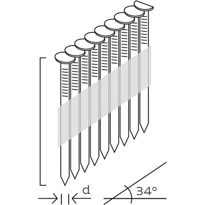 Hřebíky páskované na papírovém pruhu pod úhlem 34°. Hřebík s D hlavou o průměru 3,1 a v délce 90 mm, hladký, pozinkovaný. V balení je 2200 ks hřebíků. Bez bombiček. Použití...