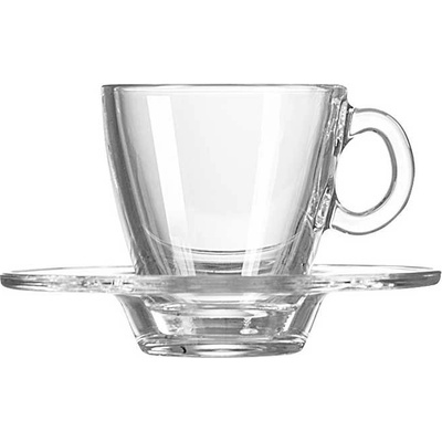 Dosebezapadající šálek a podšálek. Šálek je ideální na horké nápoje jako je čaj nebo káva. Vyrobený ze silného lisovaného skla.