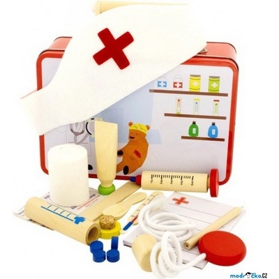 Dřevěná hračka - doktorský plechový kufřík s dřevěnou rukojetí. V kufříku najdete vybavení pro, u dětí oblíbenou, hru na doktorku či sestřičku. Děti mohou ošetřovat například...