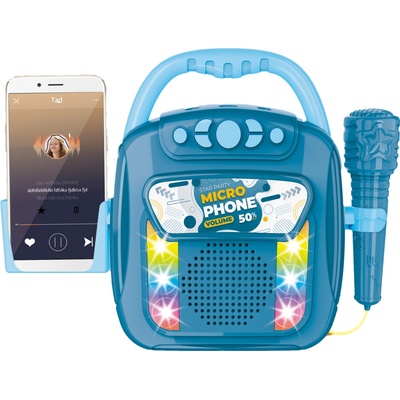 Hudební box s mikrofonem a bluetooth. Velikost 28 cm. Bateriový pack 3.7V součástí balení. Obsah balení - hudební box, USB nabíjecí kabel, držák na mobilní telefon, mikrofon....