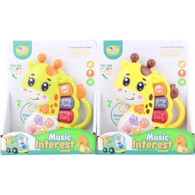 Plastové piánko ve tvaru žirafy. Hraje a vydává zvuky zvířátek. Napájení na 2 AAA baterie (jsou součástí balení). Rozměry piánka cca 12 x 16 cm. Rozměry balení cca 16 x 19 x 5...
