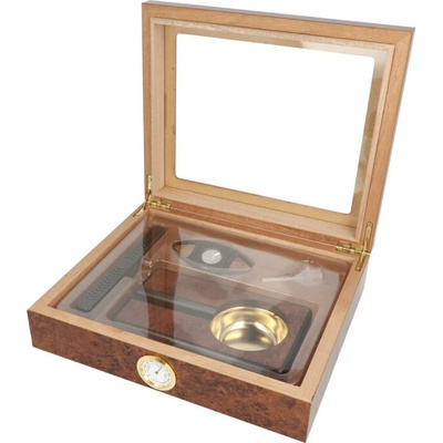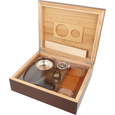 Doutníkový Humidor Set. Stolní humidor na doutníky s kapacitou cca 30 doutníků. Sada obsahuje: popelník, pouzdro na dva doutníky, vlhkoměr, zvlhčovač a ořezávač. Vnitřek...