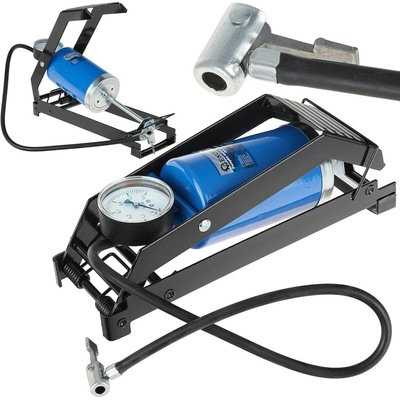 Celokovová nožní hustilka s manometrem, určená pro huštění pneumatik automobilů, motocyklů, také jízdních kol, matrací apod. Součástí balení jsou různé adaptéry....