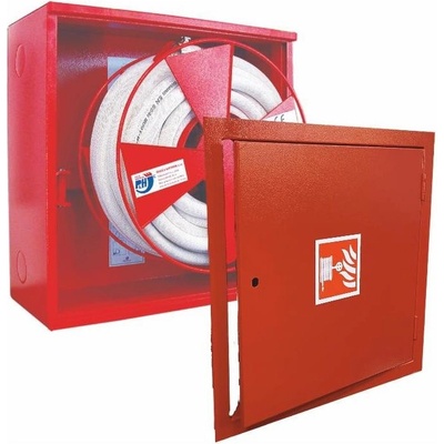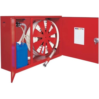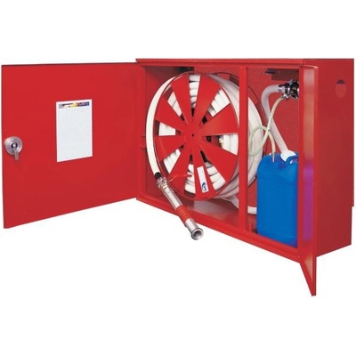 Hydrantový systém s tvarově stálou hadicí D25 a se skřínkou na ruční hasicí přístroj. Obě skříňky jsou vyrobeny v jednom bloku.
