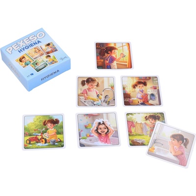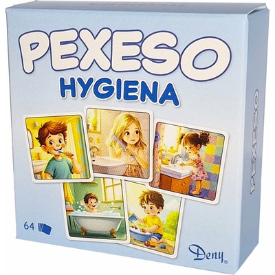 Pexeso s motivy osobní hygieny. Balení obsahuje 64 karet (32 párů) + 2 karty s pravidly. Rozměr: balení 8 x 8 x 2,5 cm