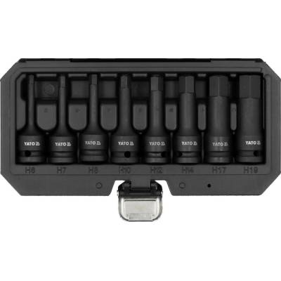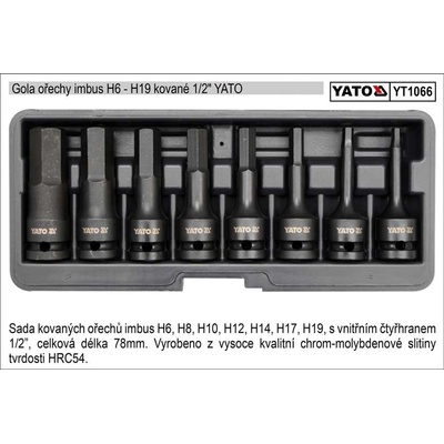 Sada nástavců 1/2" rázové, 8 ks, H6-H19, imbus, CrMo, YATO-1066 Hlavní technické parametry: - kusů v sadě: 8 - velikost zakončení: 1/2" - délka: 78 mm - tvrdost (HRC): 54...