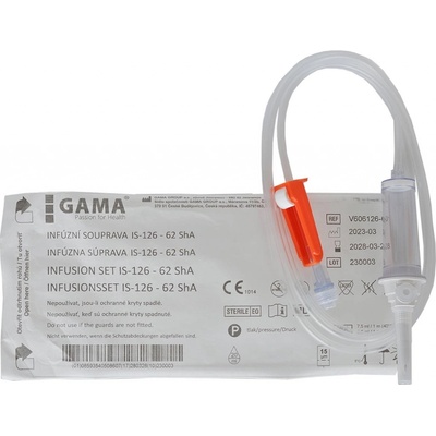 GAMA Infuzní souprava IS 103 \nInfuzní souprava IS 103 slouží k terapeutickému podávání infúzních a injekčních roztoků z lahví nebo plastových vaků do žíly pacienta vlivem působení gravitace. \n \nVlastnosti: \n \n 15 µm infúzní filtr \n hydrofóbní bakteriální filtr v...