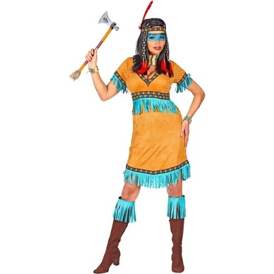 Dámský karnevalový kostým severoamerické indiánky. Velikost: XXL Materiál: 100% polyester Kostým indiánské ženy obsahuje: šaty, pásek, čelenku s pérem