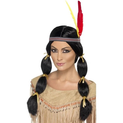 Indiánská paruka dívčí (3)Dětská černá indiánská culíkatá paruka s čelenkou a pérem. Doplněk ke kostýmu indiánky. Barva: čená Materiál: 100% polyester Určeno pro: dívčí Typ...