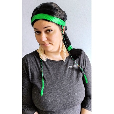 Paruka indiánky s culíky a čelenkou. Důležitý doplněk indiánského kostýmu Rybany. Barva: černá Materiál: 100% polyester Určeno pro: dámská Typ paruky: dlouhá s culíky...