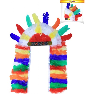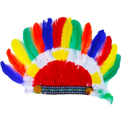 Pestrobarevná čelenka pro bojovníka nebo náčelníka indiánů. Délka je velká cca 21 cm po natažení až cca 30 cm. Délka per je cca 12 cm. Vhodná na indiánské tábory nebo...