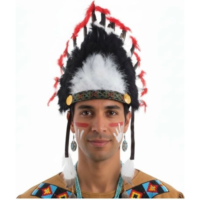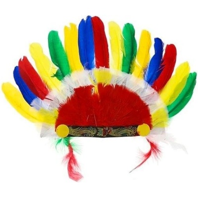 Karnevalová Indiánská čelenka Náčelníka Apačů. Vnější strana je pokryta barevným peřím upevněným na výztužné podložce a je k ní připevněna gumička, díky které dobře drží na...