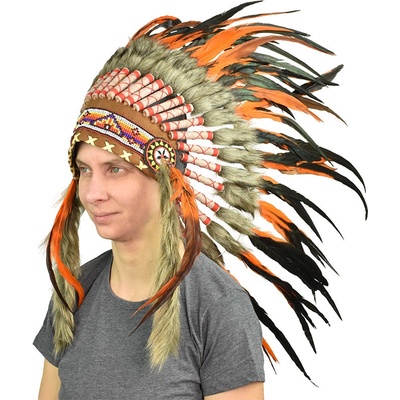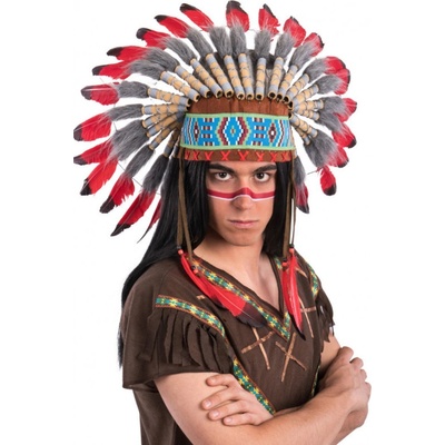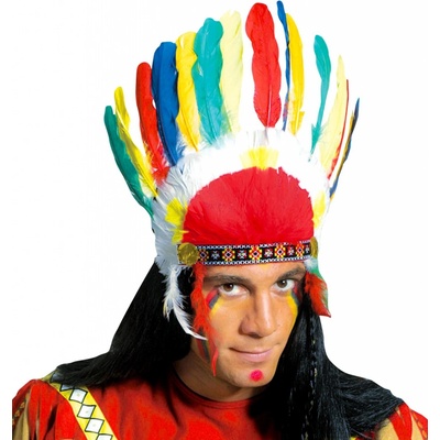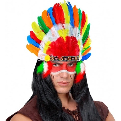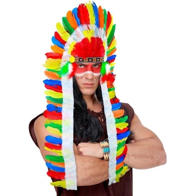 Luxusní indiánská čelenka péřová Apač Indiánská náčelnická čelenka, plná barevných peří. Ideální pro vydávání se za indiánského náčelníka na večírku s westernovou tématikou....