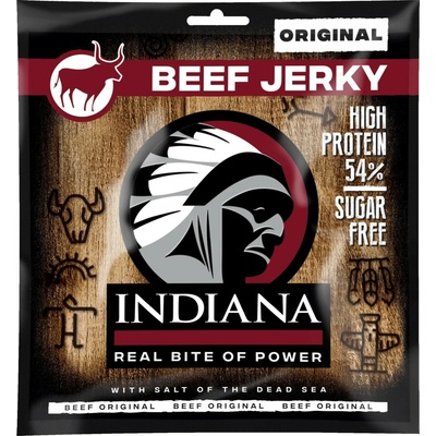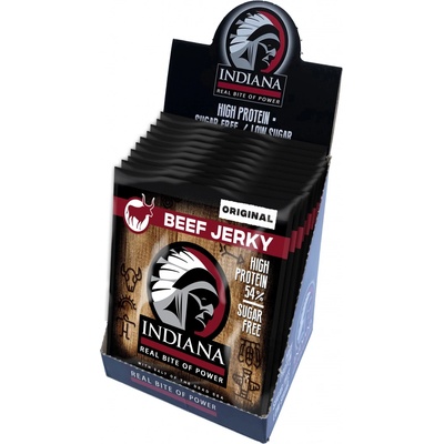 -- Hovězí Original 25 g. Jste připraveni na pořádnou chuť masa? Indiana Jerky jsou tence nakrájené plátky libového masa, dále marinované, sušené a zauzené kouřem z bukového dřeva. Sušení je jeden z nejstarších způsobů úpravy jídla pro dlouhodobé skladování. Téměř k...