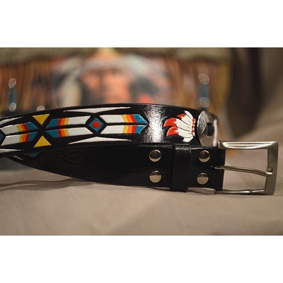 Kožený opasek - černý, zdobený. Ruční řemeslná práce, vyrobeno z hovězí usně, ručně barvené, impregnované. Motiv indiánský, ručně vytepaný do kůže, zdobený končama. Šířka 3,5...
