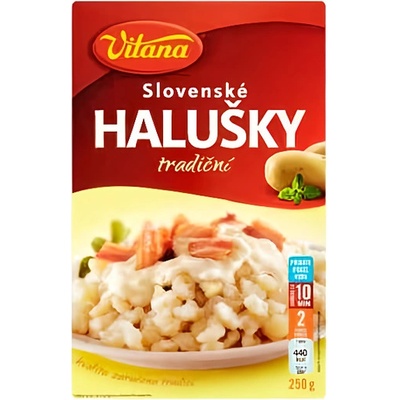 Vitana Slovenské halušky sypká směs 1x250g ZÁKONNÝ NÁZEV POTRAVINY Slovenské halušky 250g SLOŽENÍ Složení suché směsi: pšeničná mouka (LEPEK), sušené brambory 16,2 %, jedlá...