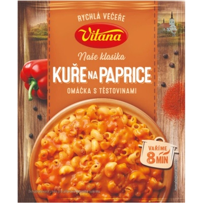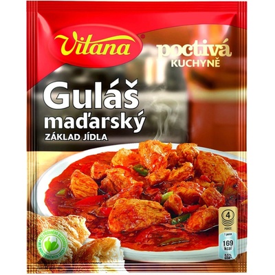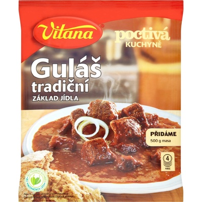 Vitana Minutka Guláš 60 g Guláš tradiční 60g SLOŽENÍ pšeničná mouka, cibule sušená mletá 21,9 %, jedlá sůl, extrakty (česnek, pepř, kmín), cibule sušená řez 5,1 %, paprika...