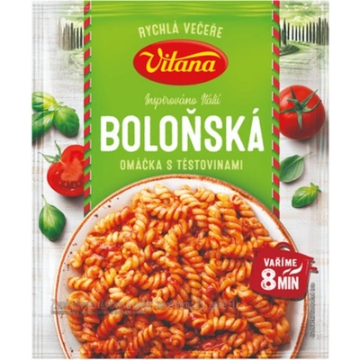 Vitana Omáčka boloňská 75g Boloňská omáčka s masem 75 g. SLOŽENÍ Složení (suché směsi): sušený rajčatový protlak, cukr, pšeničná mouka, škrob, sušená zelenina (cibule,...