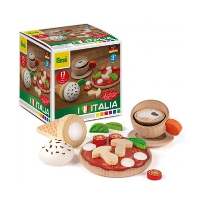 Sada potravin ze dřeva v papírové krabičce. Obsah balení: 1 základ pro pizzu, 2 plátky žampionů, 3 plátky cherry rajčátek, 3 kousky mozzarelly, 3 lístky bazalky, 1 šálek...