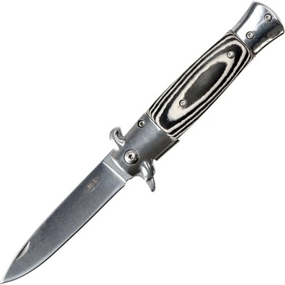 masivní nůž typu motýlek 155g s odlehčovacími otvory, tréninkovou nenaostřenou nerezovou čepelí 95mm a stříbrnou střenkou zamak jištěnou západkou