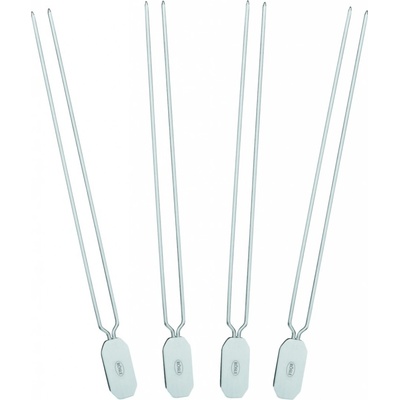 Sada špízů 4 ks dvojité, nerezové Rösle 25069 Dvojité špízy jsou vhodné pro přípravu šťavnaté zeleniny, masa a hub. Díky dvojité vidlici se pokrmy při grilování neprotáčí. Tvar špízů umožňují snadné otáčení pomocí kleští i grilovacích rukavic. Dvojité špízy z nerezové...