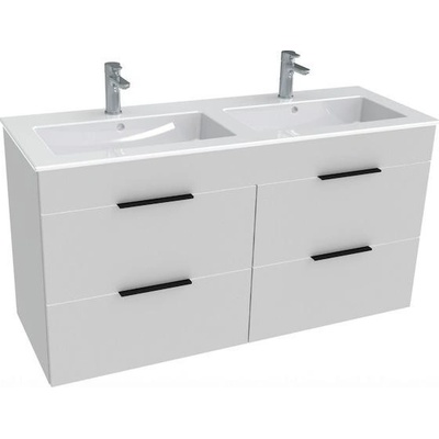 Závěsná skříňka včetně dvojumyvadla barva bílý lak rozměr skříňky 1160 x 422 x 607 mm materiál dřevotřísková deska 4x zásuvka rozměr umyvadla 1200 x 430 mm výška okraje umyvadla 15 mm materiál sanitární keramika skříňka je dodávána s černými úchytkami