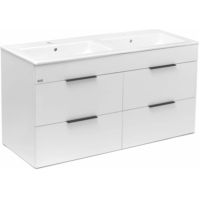 Závěsná skříňka Cube s dvojumyvadlem, 4x zásuvka, rozměry 120x43x62,2 cm, otvor pro baterii, přepad, materiál sanitární keramika, korpus MDF, barva bílá lesk/mat UPOZORNĚNÍ : Odpadová souprava není standardní součástí dodávky a je nutno ji dokoupit zvlášť. Kompatibilní...