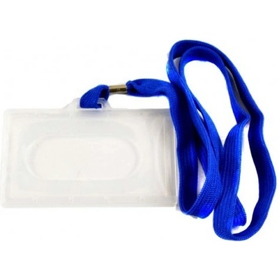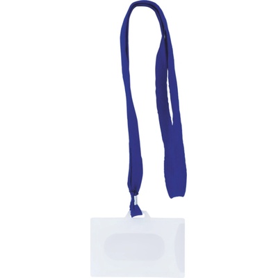 Jmenovka s textilním páskem- modrá Obvod: 84 cm Délka: 42 cm Šíře: 1 cm Rozměr jmenovky: Délka: 9,2 cm Šířka: 5,7cm Průhledný plastový identifikátor s matnou úpravou. Součástí...