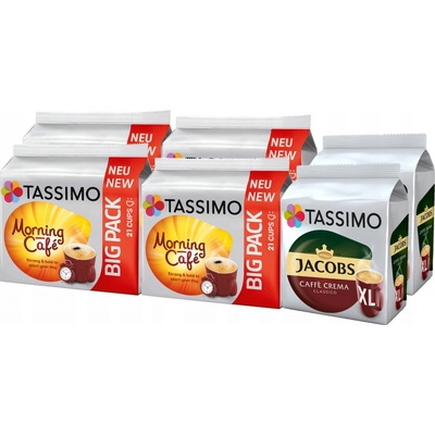 Kávová sada Tassimo pro dokonalé ráno, 116 kusůSložení sady - Kapsle Tassimo Morning Cafe Strong&Intense (4x21 kusů ) - Tassimo Cafe Crema Classico XL kapsle (2x16 kusů...