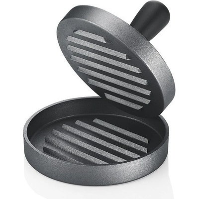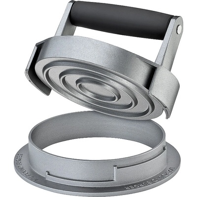 2dílný press na hamburger s non-stick povlakem. Forma pro tvoření hamburgerů, včetně typických drážek. Pro snadné odstranění masa z formy, doporučujeme vnitřek lehce naolejovat, nebo vložit kus pečicího papíru. Rozměry: Průměr: 12 cm