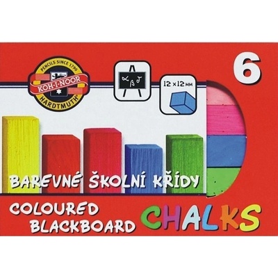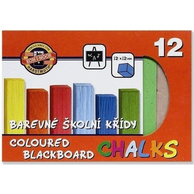 Souprava 12 kusů školních barevných čtyřhranných kříd o rozměrech 12x12x100 mm, které jsou určeny pro psaní na školní tabule.