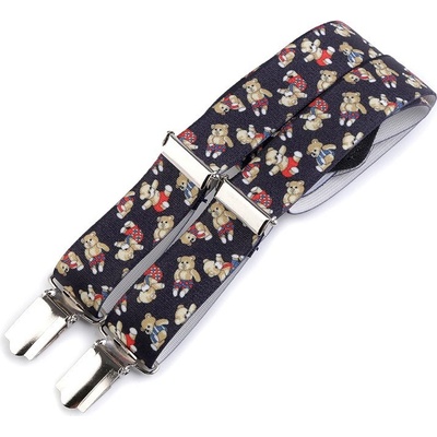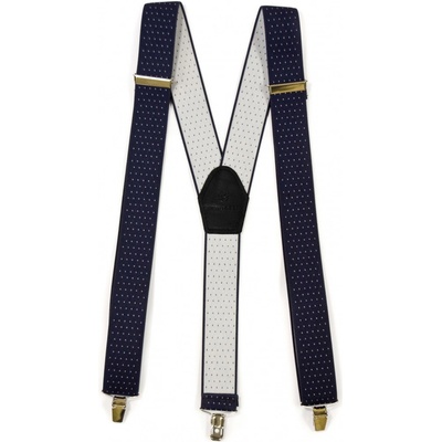 Pánské šle v tmavě modré barvě s bílými tečkami s nastavitelnou délkou 125 cm, šíře 3 cm v provedení ve tvaru písmene "X" s uchycením na žabky.