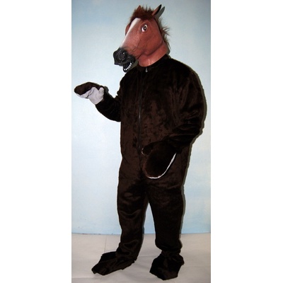 Hnědý overal - kostým s maskou koně. Součástí jsou přišité rukavice - ruce a návleky na boty upevňující se pomocí gumičky. Rozměry overalu - kostýmu: délka od paty k ramenům cca 172 cm šířka v pase 2 x 68-70 cm délka rukávu od ramene k zápěstí cca 61 cm.