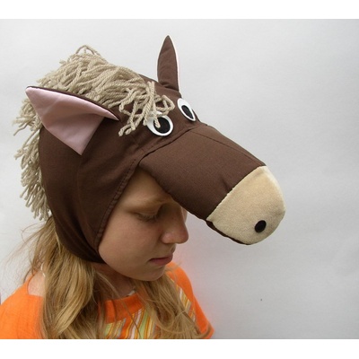 Hnědý overal - kostým s maskou koně. Součástí jsou přišité rukavice - ruce a návleky na boty upevňující se pomocí gumičky. Rozměry overalu - kostýmu: délka od paty k ramenům...