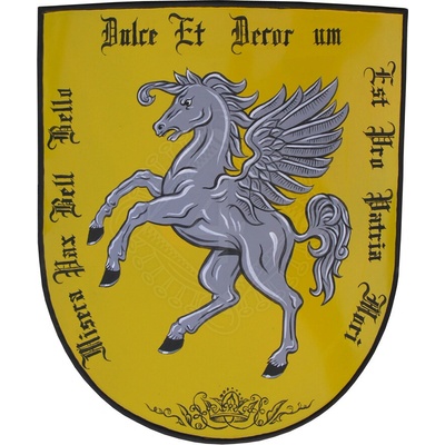 Štít Okřídlený kůň na žlutém poli Rozměry cca 50x44cm Tento štít je ručně malovaný. Na přání Vám jej necháme pomalovat podle Vaší vlastní předlohy.