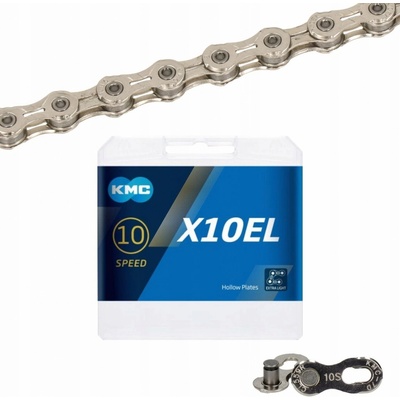 KMC X10 EL je superlehký 10rychlostní řetěz pro horská i silniční kola. Speciální niklovaný povrch ve stříbrné barvě Odlehčené vnitřní i vnější články řetězu Včetně spojky MissingLink Počet článků: 114