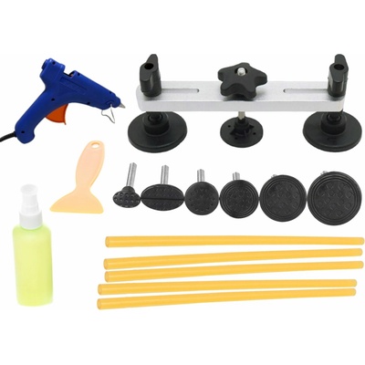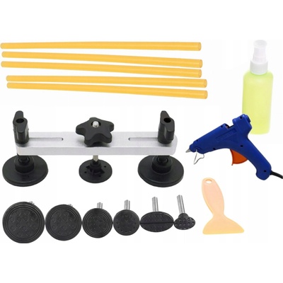 Sada na opravu promáčklin s tavnou pistolíSada nářadí pro opravu promáčknutí kovových dílů karoserií automobilů a motocyklů. Konzola se po odmaštění přilepí na karoserii prostřednictvím tavného lepidla a středovým šroubem následně vytáhneme požadovanou část karoserie....