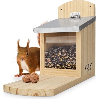 Dřevěné krmítko pro veverky s plexisklem - Dřevěné krmítko s plexisklem pro pomoc veverkám na vaší zahradě. Díky zavírací stříšce je potrava uvnitř nedostupná pro ptáky. Krmítko může být velmi snadno plněno oříšky nebo jinou potravou pro veverky.