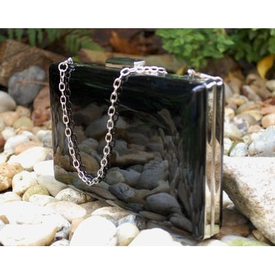 Černá lakovaná luxusní kabelka, pevný tvar, vyztužená, dlouhé stříbrné řetízkové ramínko. Zapínání na stříbrný obdélník. Vnitřek saténové, lemování ze stříbrného kovu. Dlouhé i...