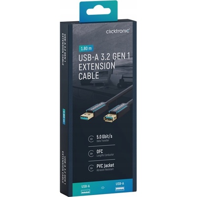 ClickTronic HQ OFC prodlužovací USB3.0 kabel, A-A, zlacené konektory, 1,8m Prodlužovací USB 3.0 kabel, rozhraní umožní rychlost až 5 Gbit/s. Kabel je velice kvalitní, dvojitě...