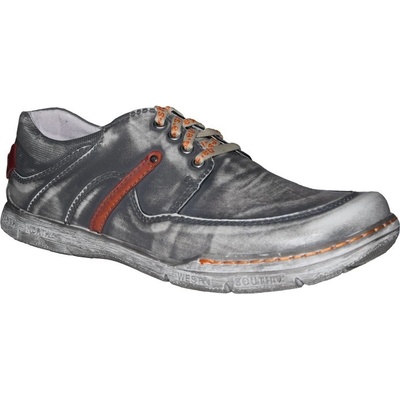 Pánská kožená vycházková obuv má svršek v černošedém odstínu doplněný drobnými detaily v červené barvě a potiskem na vnější straně. Část svršku má na vnější i vnitřní straně ražený povrch. Komfort a pohodlí poskytne měkká kožená stélka i podšívka a flexibilní podešev....