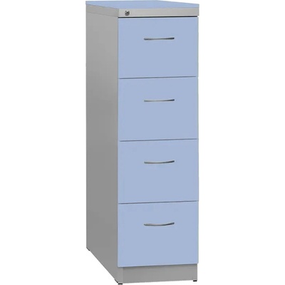 Čtyřzásuvkové kovové kartotéky pro dokumenty nebo závěsné pořadače formátu A4 nebo Foolscap, šířka 413 nebo 470, výška 1321, hloubka 622 mm, centrální zámek, různé barvy.