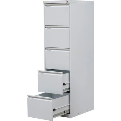 Kovové kartotéky pro rozšířený formát A4. Pět zásuvek s plným dnem bez perforace lze plně vysunout. Centrální uzamykání. Kartotéky jsou vybaveny proti vysunutí více zásuvek...