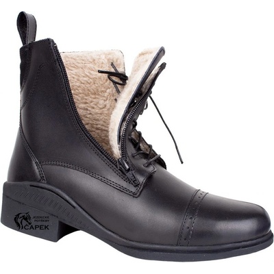 Oblíbená zimní jezdecká pérka šněrovací, z olejované kůže, hřejivá výstelka z umělého beránku, pevná přišitá gumová podrážka.