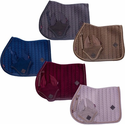 Sametová podsedlová dečka s novým vzorem prošívání v sadě s náušníky. Ozdobná kroucená šňůra a výšivka v barvě rosegold. Spodní strana z rychleschnoucí HI-TECH síťoviny