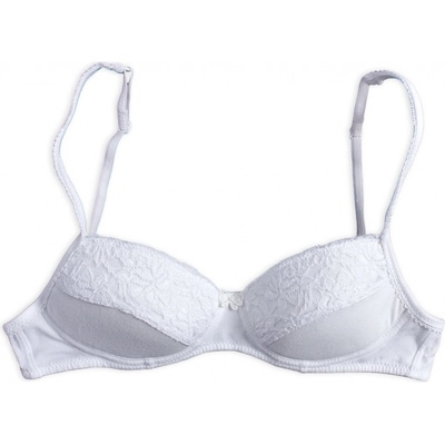 Jednobarevná dívčí podprsenka s jemnou krajkou. Bez kostic, košíčky mírně vyztužené. Nastavitelná délka ramínek. Zapínání vzadu na jeden háček.